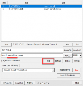 たとえば、日英翻訳において「タッチパネル」の訳語をGoogle翻訳で「touch panel」と取得した場合に、「touch sensitive panel」に修正する場合を想定します。