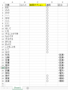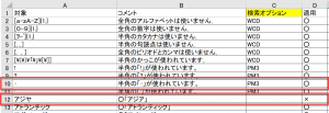 また、12行目の「アジヤ」については、D列が「×」になっているので検索をしません。ちなみに、12行目には検索オプションが空欄になっていますので、もし検索をするのであれば「半角と全角を区別する」条件での検索となります。