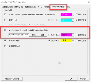 チェック項目(キーワード)とコメントが記載されたExcelファイルを用意し、チェックのオプションダイアログの[キーワードの着色2]タブで指定します。