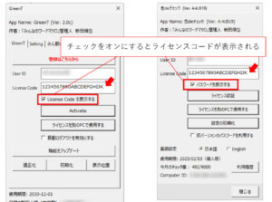 以下の例では、GreenTの[ライセンス情報詳細]をクリックして、ライセンスコードを表示しました。