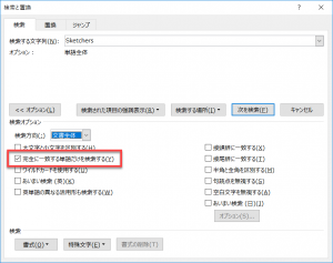 [完全に一致する単語だけを検索する]はそもそも1語の英単語にのみ有効な機能で、複合語(半角スペースを含む文字列)ではオンにできません。このチェックをオンにすると、部分的に一致するものを検索できなくなりますので、上記のようにsemiconductor内のiconを見つけられなかったのです。それと同時に、和文中で前後に半角スペースの切れ目のないSketchersも検索できなかったのです。