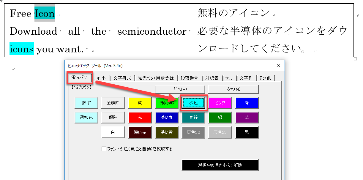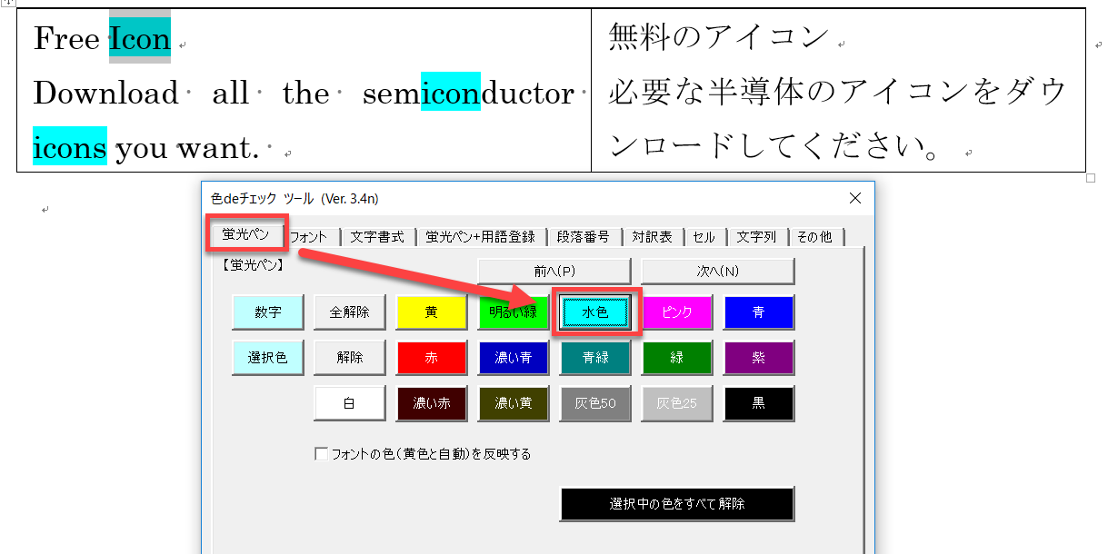 以下のようなケースもあります。iconという単語を着色してみました。色deチェックでは、用語の着色時に英語の場合には複数形も自動的に着色できるようになっています。なので、icons も着色されているのです。