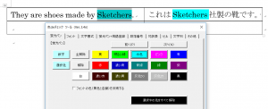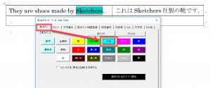 以下のように文字列を選択して[ツール]ダイアログの[水色]ボタンをクリックしても、英文中の文字は着色されるのですが、和文中のアルファベットに蛍光ペンがつきません。