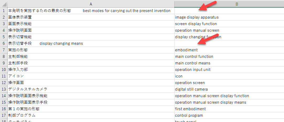 これをExcelに貼り付けると以下のようになります。なので、用語集の表記が変わってしまうということです。