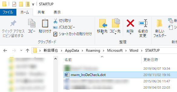 このダイアログから、Wordの[STARTUP]フォルダを開くと、その中に対象のファイルが見つかります。