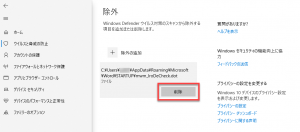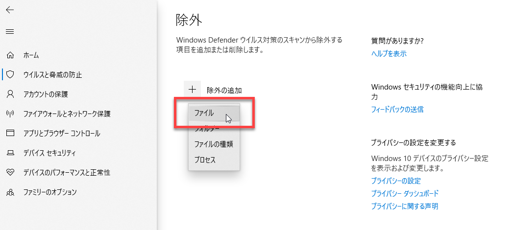[除外の追加]をクリックして[ファイル]を選択するとダイアログが開きます。