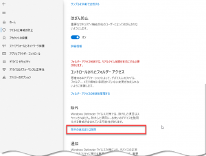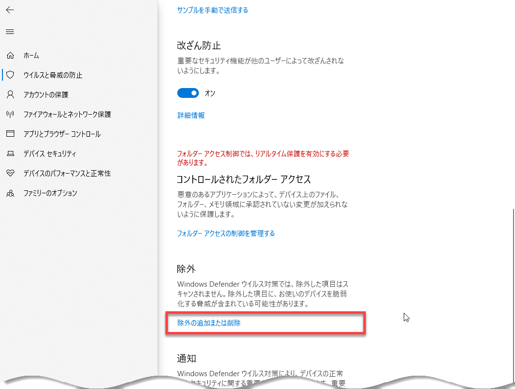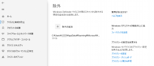 表示されるページを下のほうにスクロールすると[除外]項目があります。[除外の追加または削除]をクリックします。