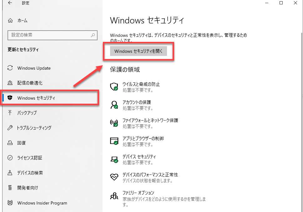 Windows Defender 以外のセキュリティソフトをご利用の場合には、以下の手順の途中で何を利用中かわかります。