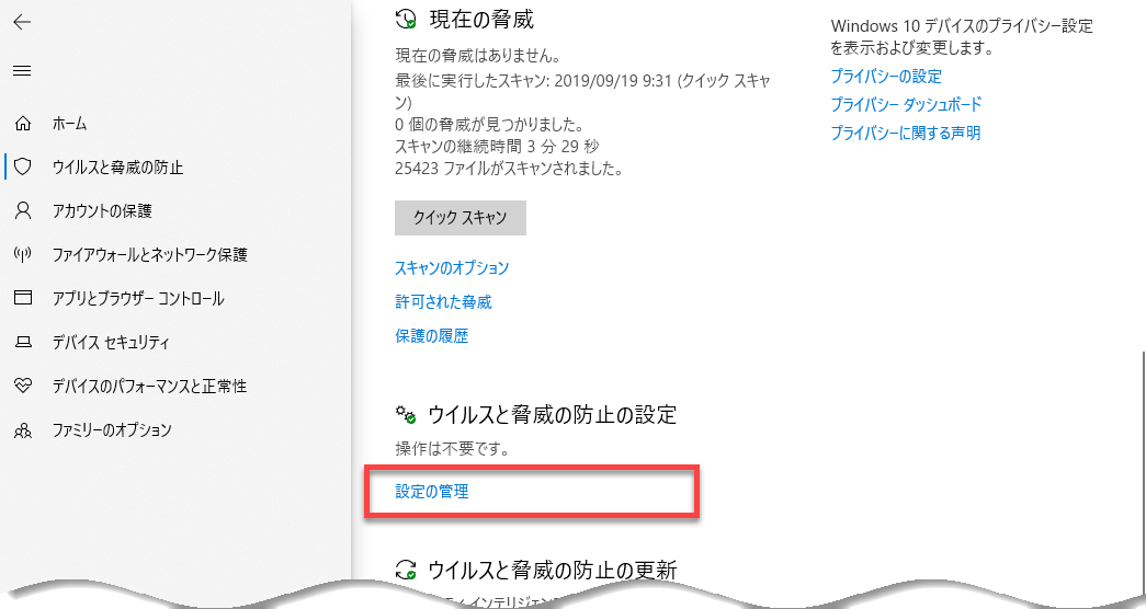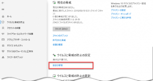 さて、Windows Defenderを使っている場合、[ウイルスと脅威の防止の設定]項目で、[設定の管理]をクリックします。