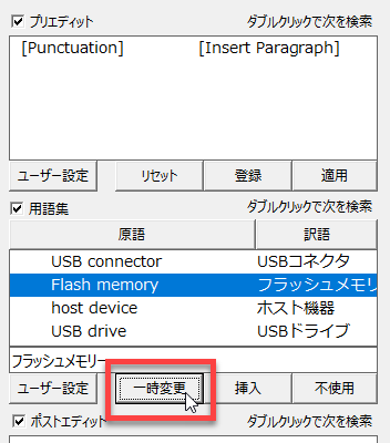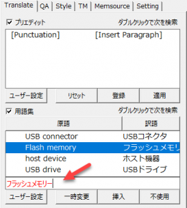 用語集のダイアログでは、訳語欄の幅が狭いために言葉がすべて表示されない場合があります。たとえば、以下のような場合、Flash memoryの訳語に長音がつくのかつかないのか見えません。