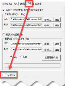 [TM]タブの[Use Felix]チェックボックスをオンにすると、訳文の挿入時に原文と訳文のペアがFelixのメモリに登録されます。