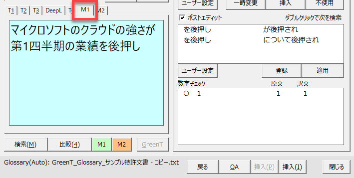 [M1]タブを開くと、[DeepL]タブに表示されていた訳文が入力されています。