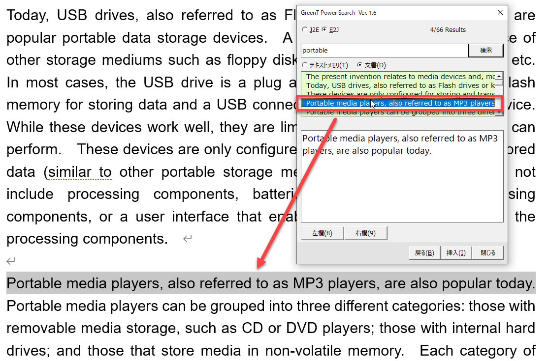 Power Searchのダイアログで文書内で検索した文にダブルクリックでジャンプできます。検索内容の前後の記述を確認する場合に便利です。