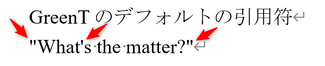 GreenTではデフォルトで引用符はまっすぐなダブルクォーテーションを使用しています。英文の入力で、[Shift]+[2]で入力するダブルクォーテーション(")です。