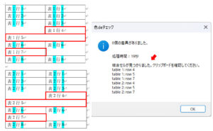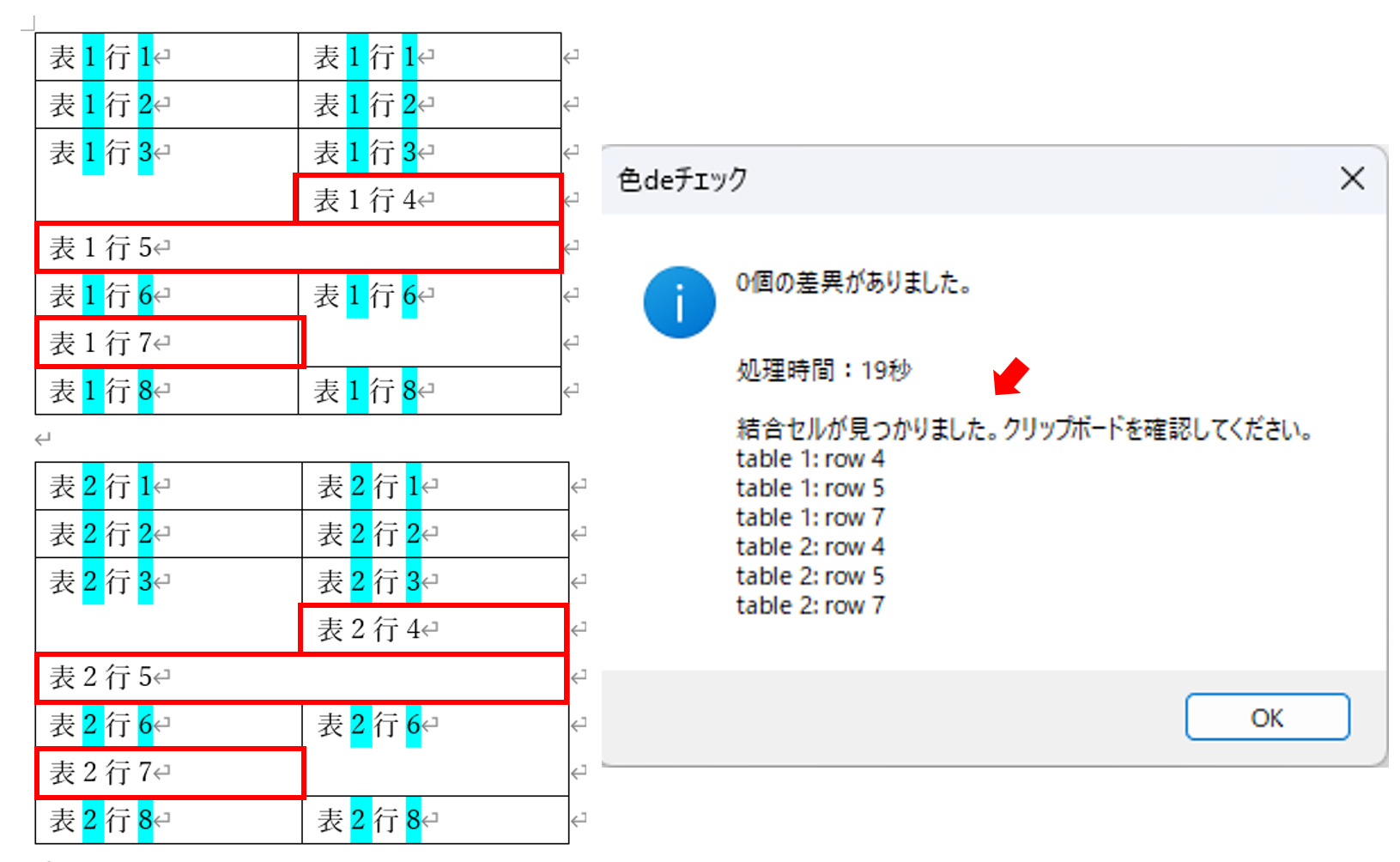 これまでは、結合セルのある対訳表でエラーが発生して処理が終了してしまうことがありました。修正しました。以下のように、結合セルのある表の番号および行番号を表示します。また、表示した内容はクリップボードに保存されているため、文書に貼り付けて確認もできます。