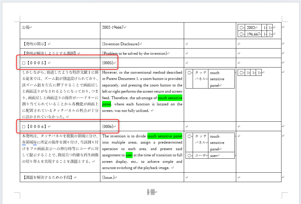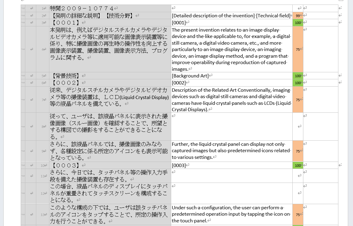 これまで、全文翻訳においては、特許明細書の段落番号などの自動処理で翻訳をする箇所は対訳表に出力しておりませんでした。そのために、対訳表で翻訳内容を確認する際に訳文ファイルとの対応づけがしにくいという欠点がありました。