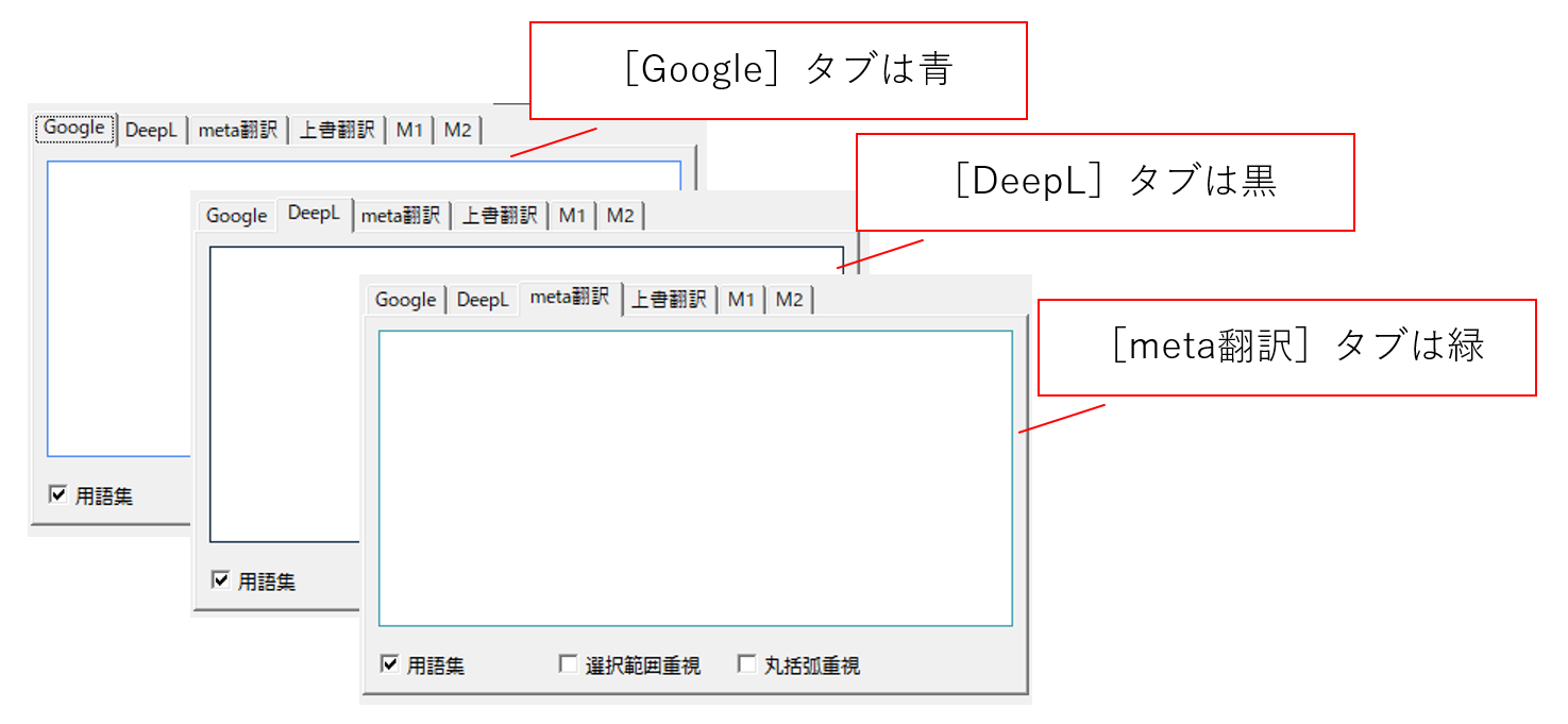 翻訳エンジンごとに枠線の色を変更します。ときどき、タブが知らない間に切り替わってしまうことがあるので、色でエンジンを区別できるようにしました。