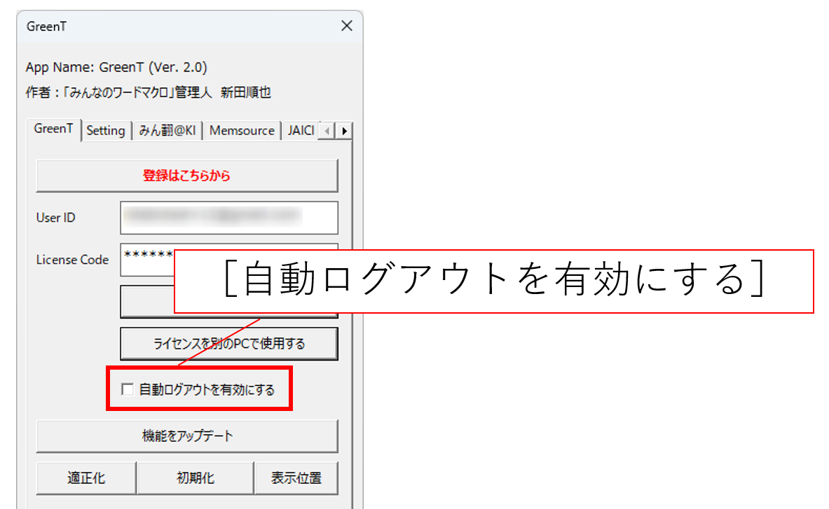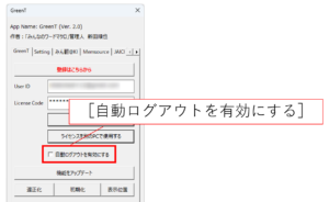 [アドイン]タブ[?]ボタンをクリックして以下のダイアログを開き、[自動ログアウトを有効にする]をオンにしてください。