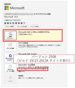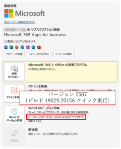 以下、サポートさせていただいたお客様からお借りしたスクリーンショットです。上記の私のWordとは表示が異なり、お客様のWordのバージョン情報には、バージョン 2508(ビルド 19127.20134 クイック実行)となっています。