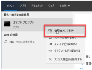 コマンドプロンプトのアイコン上で右クリックをして、[管理者として実行]を選択します。