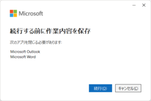 Wordなどのアプリを開いている場合には、以下のようなメッセージが表示されますので、アプリを閉じて[続行]ボタンをクリックしてください。