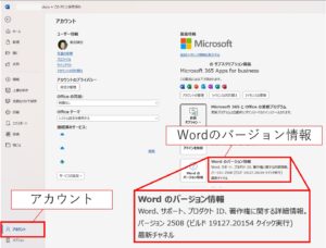まずはバージョンの確認です。[ファイル]タブからバックステージビューを開きの[アカウント]をクリックして、Wordのバージョン情報を確認してください。不具合が発生している場合、このバージョン番号がバージョン 2508(ビルド 19127.20134)バージョン 2508(ビルド 19127.20154)になっています。