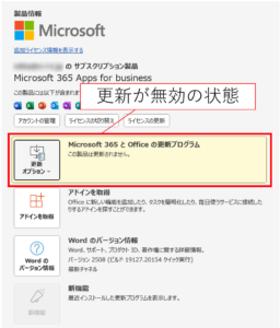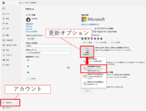 [ファイル]タブからバックステージビューを開きの[アカウント]をクリックして、[更新オプション]をクリックしメニューから[更新を無効にする]を選択します。