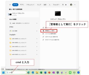 別の方法として、以下のようにタスクバーの検索窓に半角でcmdと入力し、検索されたコマンドプロンプトに対して[管理者として実行]をクリックしても起動できます。