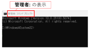 タイトルバーに、「管理者:コマンドプロンプト」と書かれていることを確認してください。そうでない場合は、ウィンドウを閉じてやり直してください。