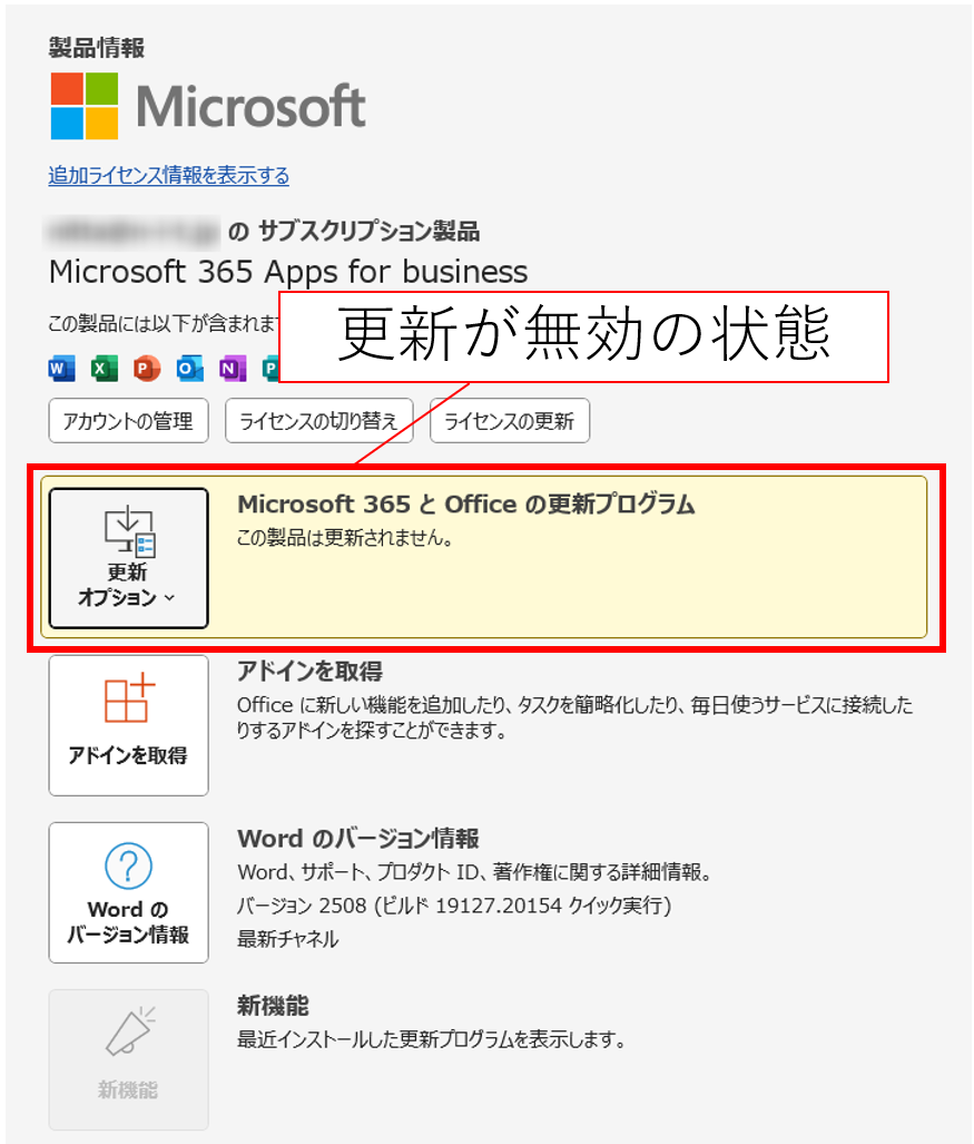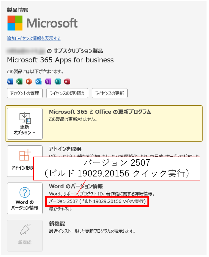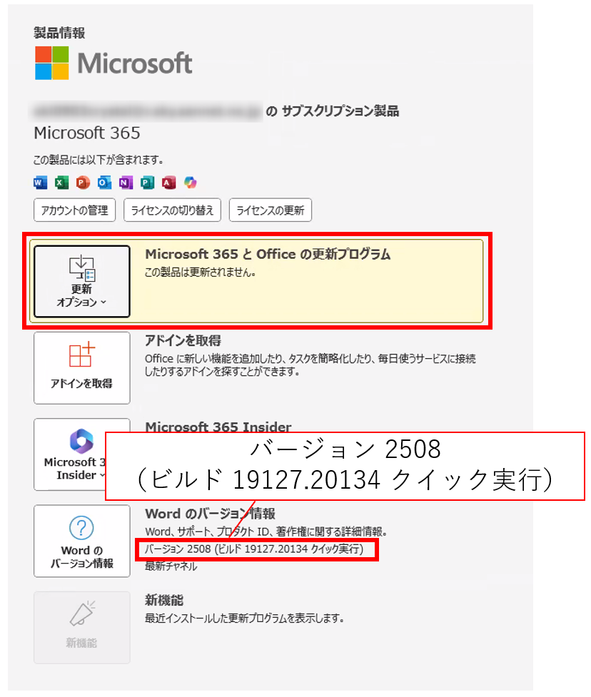 以下、サポートさせていただいたお客様からお借りしたスクリーンショットです。上記の私のWordとは表示が異なり、お客様のWordのバージョン情報には、バージョン 2508(ビルド 19127.20134 クイック実行)となっています。