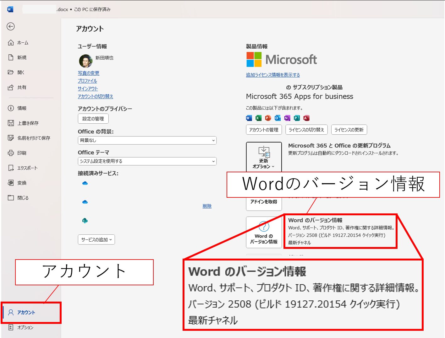 まずはバージョンの確認です。[ファイル]タブからバックステージビューを開きの[アカウント]をクリックして、Wordのバージョン情報を確認してください。不具合が発生している場合、このバージョン番号がバージョン 2508(ビルド 19127.20134)バージョン 2508(ビルド 19127.20154)になっています。