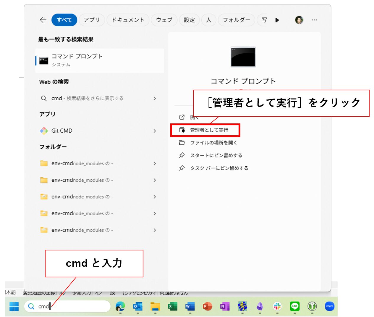 別の方法として、以下のようにタスクバーの検索窓に半角でcmdと入力し、検索されたコマンドプロンプトに対して[管理者として実行]をクリックしても起動できます。
