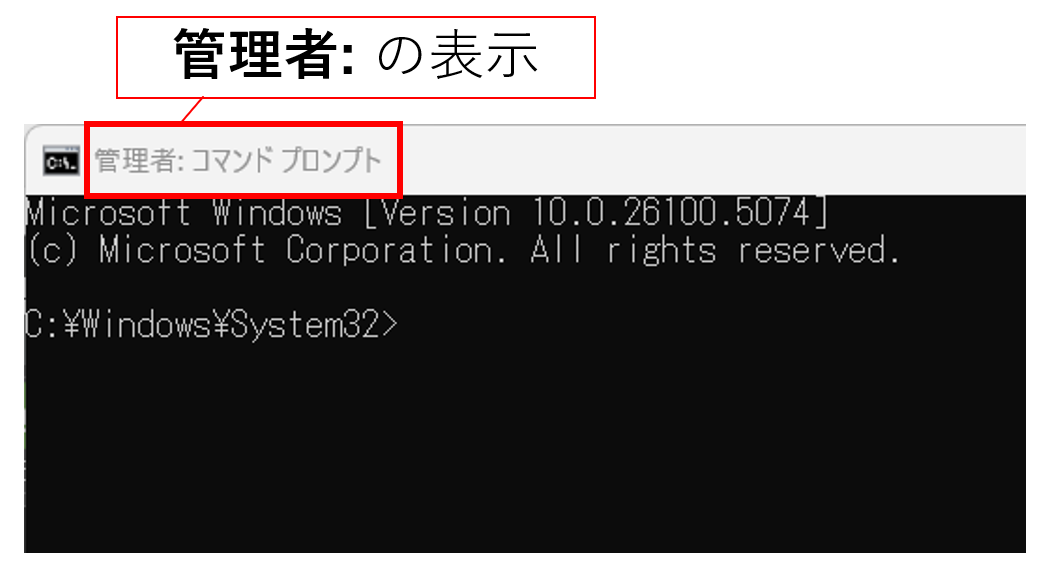 タイトルバーに、「管理者:コマンドプロンプト」と書かれていることを確認してください。そうでない場合は、ウィンドウを閉じてやり直してください。