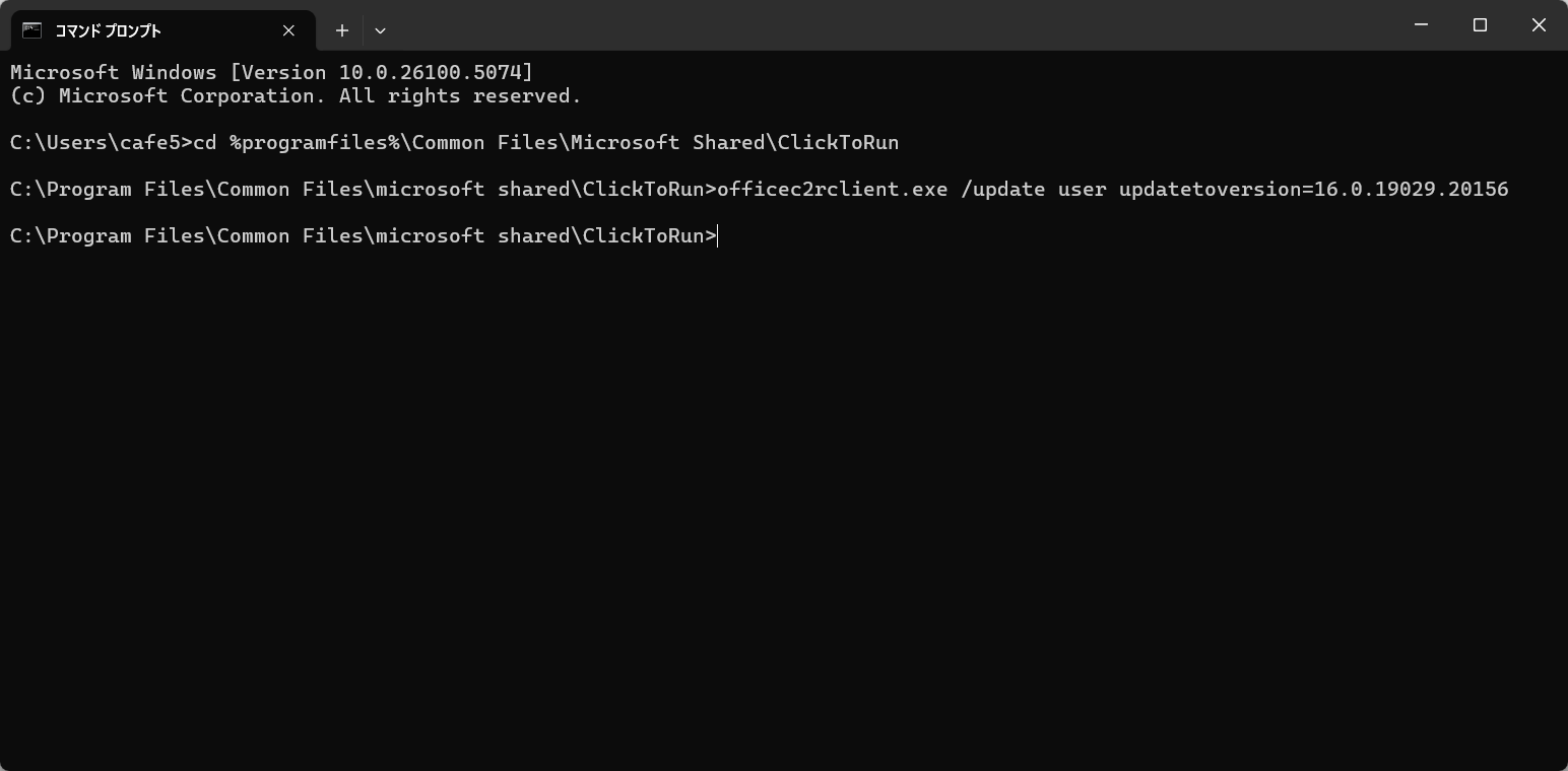 自分のアカウントではない場合には、アカウント画面で自分のOfficeのアカウントに切り替えると、[更新オプション]ボタンが表示されコマンドプロンプトも想定通り動作するようになります。