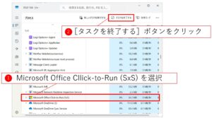 以下のように、Microsoft Office Cllick-to-Run の項目を選択し、右上にある[タスクを終了する]ボタンをクリックします。