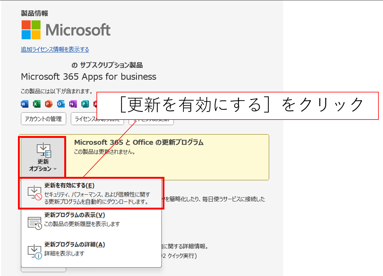 - 組織(企業や団体など)のアカウントを利用する場合も、その組織のOfficeの設定に基づき[更新オプション]ボタンが表示されないことがあります。