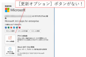 - 組織(企業や団体など)にお勤めの場合、組織がユーザによるOfficeの更新を制限するために、[更新オプション]ボタンを表示しない設定にしていることがあります。