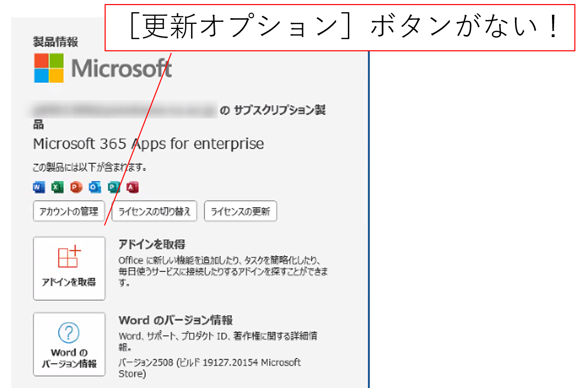 ご利用のWordによっては、アカウント画面に[更新オプション]ボタンが存在しない場合があります。以下のような表示です。お客様からスクリーンショットをいただきました。