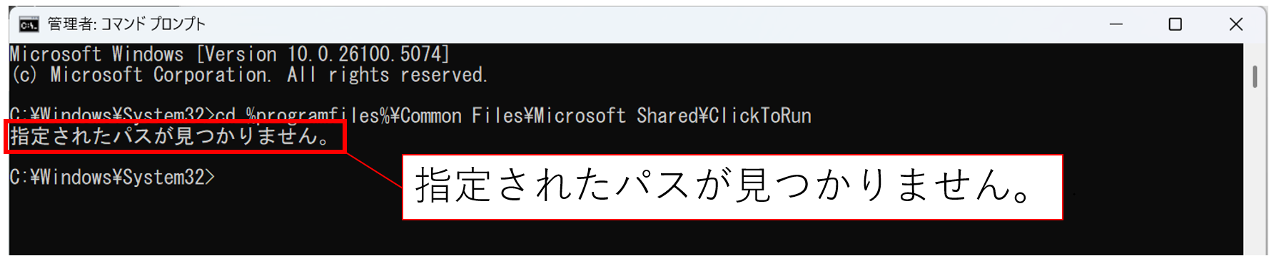 このような状態でコマンドプロンプトを管理者として1つ目のコマンドを実行しても、以下のように「指定されたパスが見つかりません。」と表示され次の操作に進めず、前のバージョンをダウンロードできません。