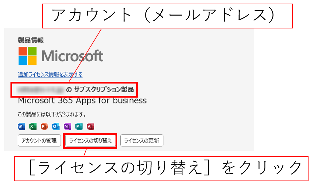 どのアカウントでOffice製品を利用しているのかは、アカウント画面にて確認できます。「(メールアドレス)のサブスクリプション製品」や「(メールアドレス)のライセンス認証された製品」などの表示があります。このメールアドレスにより自分のものなのか、組織のものなのかを判断できます。