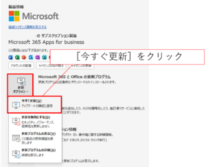 - パソコンにプレインストールされたOfficeの場合、ユーザーが更新の操作をすることを禁止した設定になっている場合があります。この場合、[更新オプション]ボタンが表示されません。