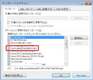 以下のとおり、「テンプレートとアドイン」のダイアログボックスで「ぱらぱら」のテンプレートである「mwm_para2translation.dot」をオンにします。