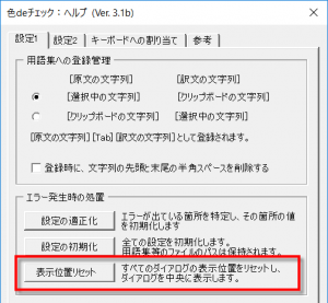 今回のバージョン(Ver. 3.1b)で、ダイアログが画面に表示されないときに表示位置をリセットするボタンを用意しました。