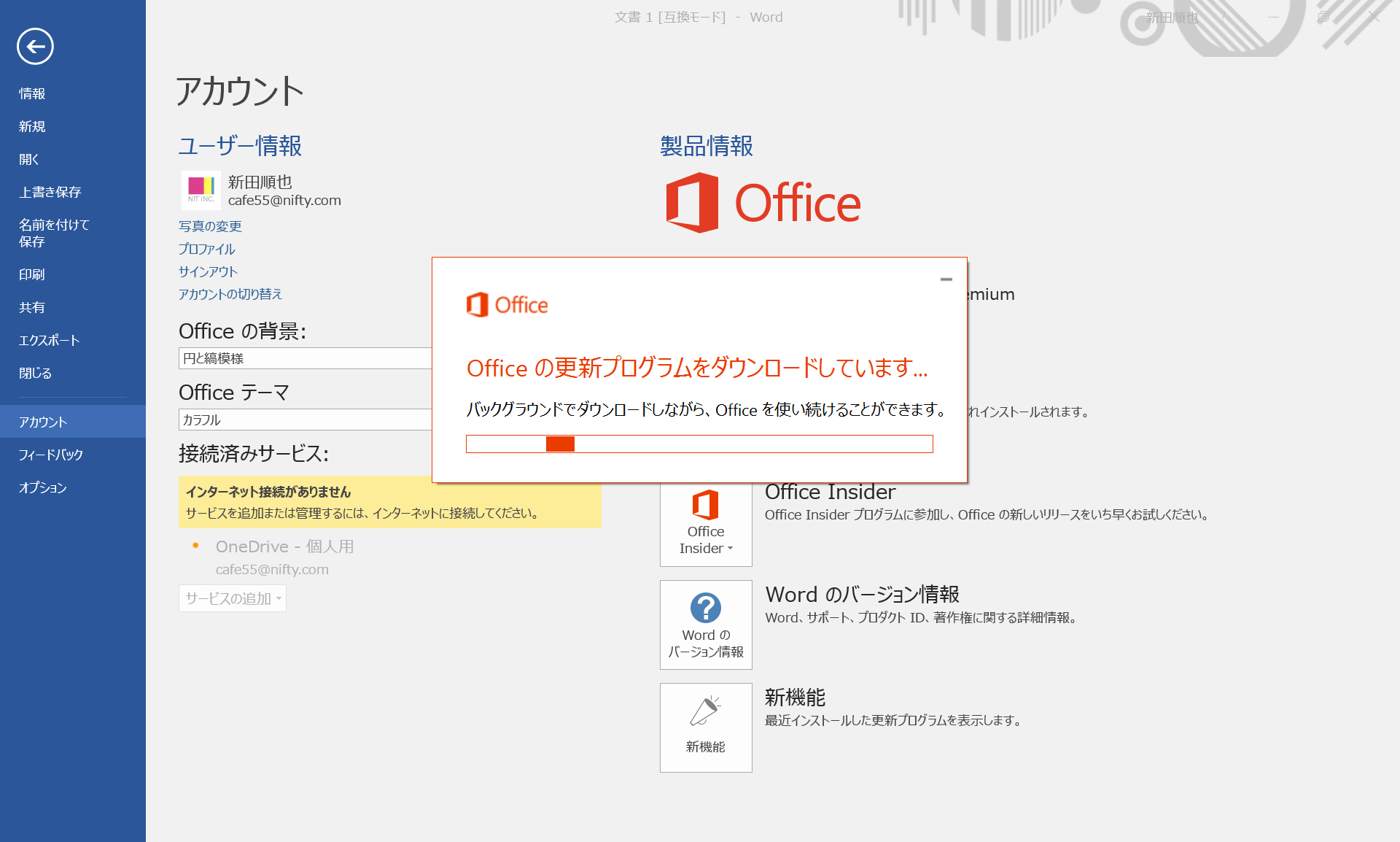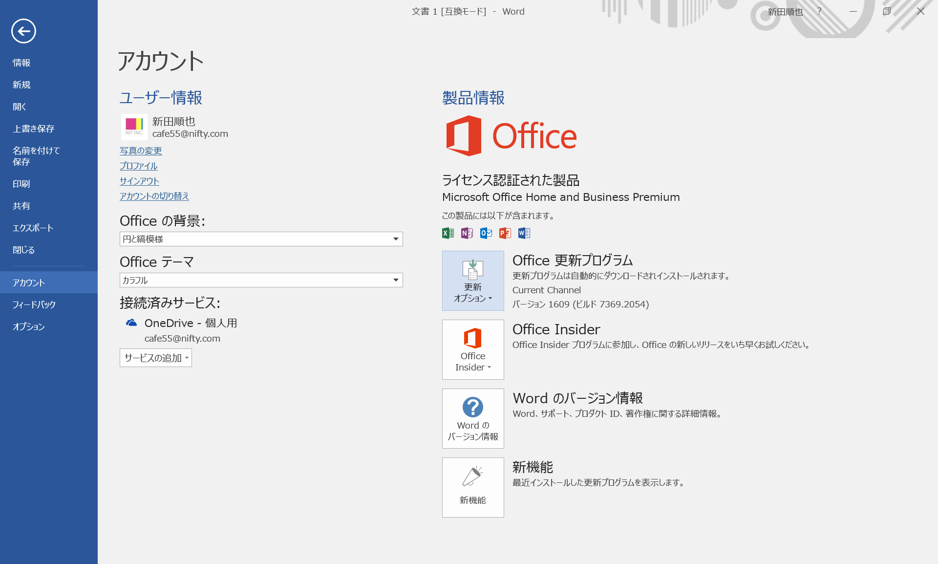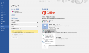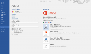 [ファイル]タブの[アカウント]をクリックしてアカウント画面を開いてください。