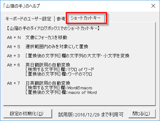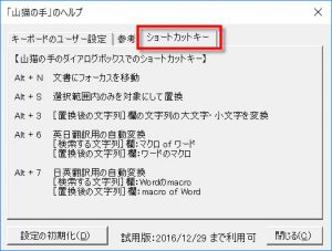 HOME > アドイン > 【山猫の手】ショートカットキーの一覧を表示する 2016年11月10日 2025年7月20日 yn21, ショートカットキー, 山猫の手 [アドイン]タブの[?]ボタンで表示される[ヘルプ]ダイアログボックスに[ショートカットキー]タブがあります。 ここに、[山猫の手]ダイアログボックスを起動したときに使えるショートカットキーを紹介しています。 セミナー報告 【セミナー報告】第4回 MTPE もやもや会アフタートークまとめ 先日の第4回もやもや会の続き記事です。 もやもや会の後で、当日の発表者3名(燃脇さん、山本さんと私新田)がオンラインで話し合う機会を持ちました。いただいたアンケート結果を見ながら意見交換をし、お互いに ... Post Share Pocket Hatena LINE URLコピー -アドイン -yn21, ショートカットキー, 山猫の手