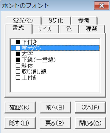使われている項目をダブルクリック、もしくは、「次へ」と「前へ」のボタンをクリックすると、選択されている書式の文字列にカーソルがジャンプします。