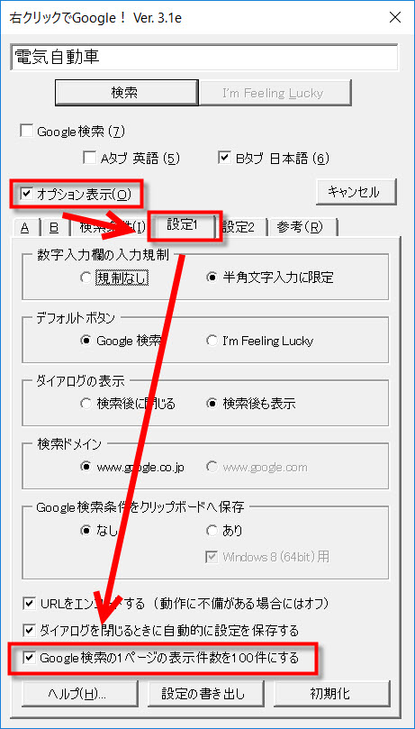 オプションを表示し、[設定1]タブの以下のチェックをオンにします。