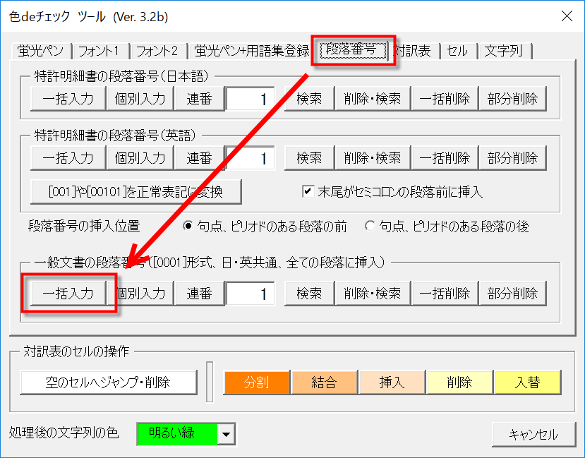 挿入された段落番号は明るい緑色の蛍光ペンで着色されています。