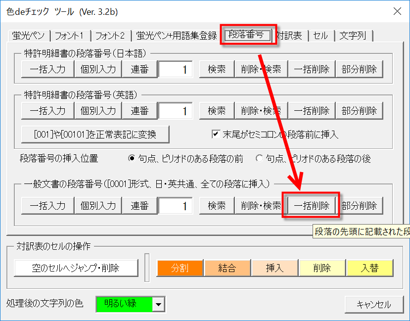 訳文を開いて、先ほどの[ツール]ダイアログボックス[段落番号]タブ[一括削除]ボタンをクリックします。