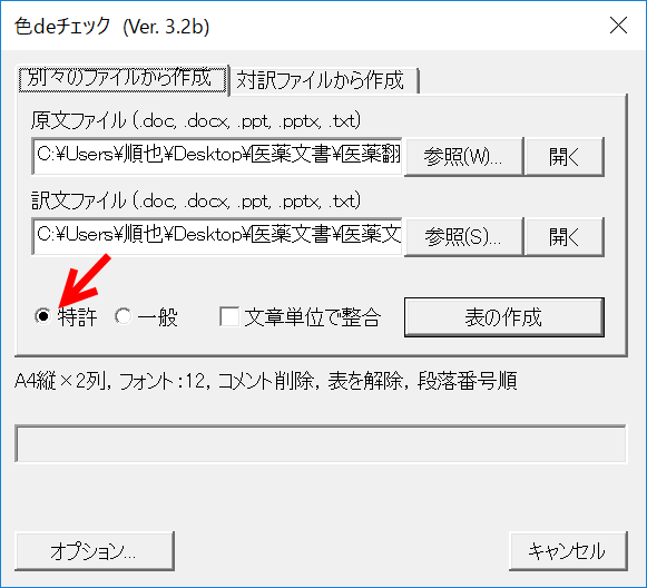 古いバージョンの色deチェックの場合、以下のように[特許]ラジオボタンを選択して表を作成します。